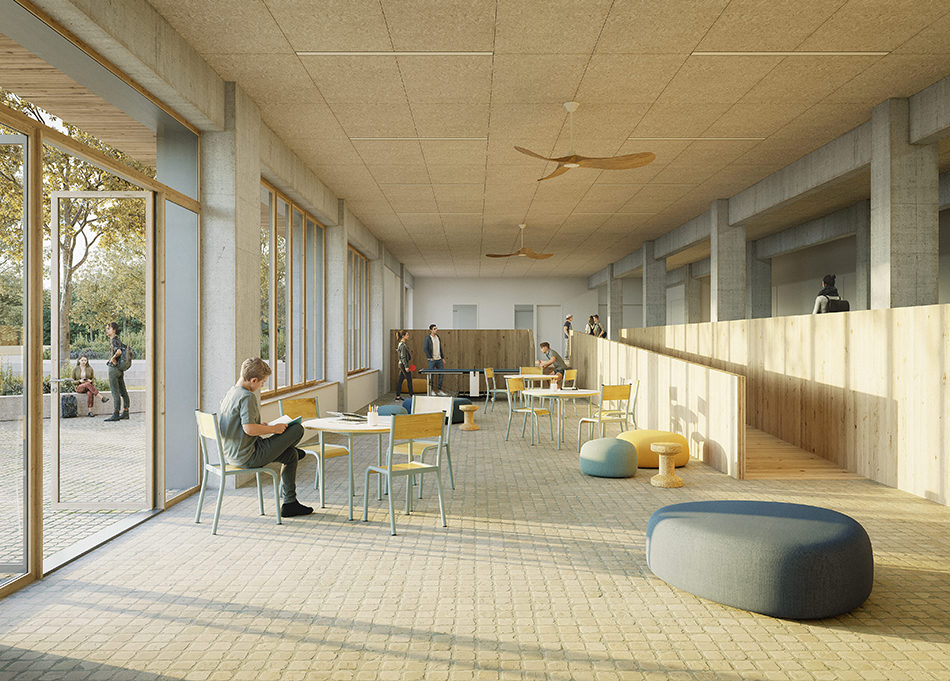 Le projet consiste à offrir des lieux de pratique et d’enseignement de qualité. L’l’intérieur du bâtiment sera réaménager, en gardant au maximum le déjà-là, pour proposer des espaces accessibles, fonctionnels et conviviaux. Le rez-de-chaussée est rendu aux étudiants avec la rénovation du foyer existant. L’infirmerie, le logement qui lui est dédié et les locaux administratifs sont installés à ce niveau pour leur permettre d’accéder aux espaces extérieurs. Les salles de classe sont agrandies et réparties sur les trois niveaux supérieurs.