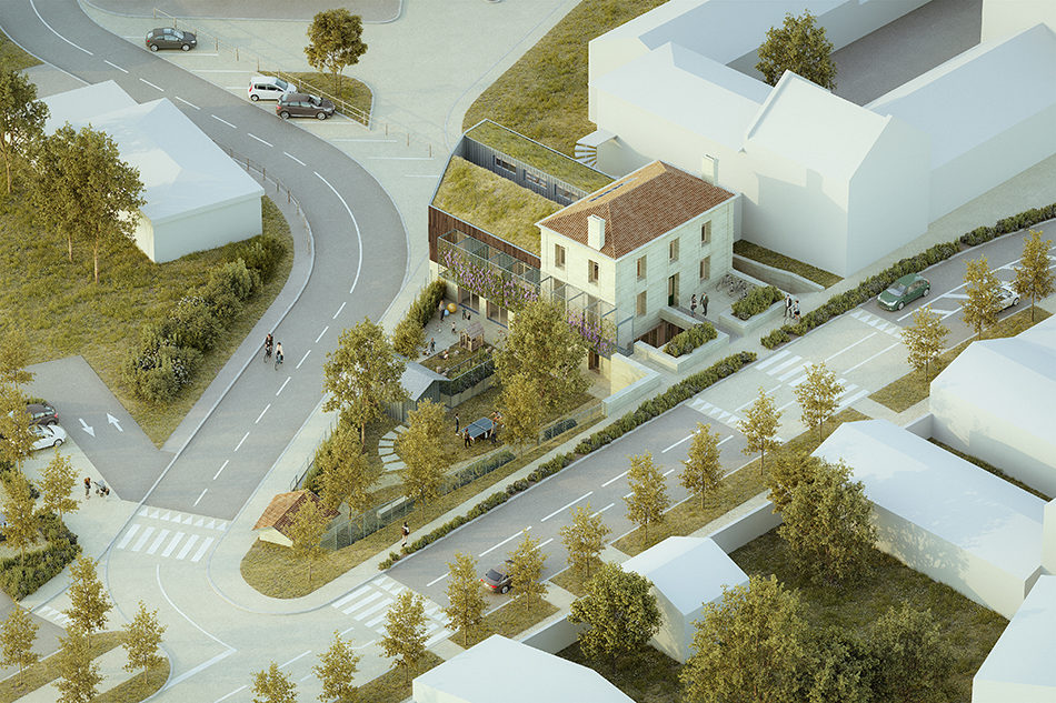 Le projet s’articule autour de la création d’une passerelle en inox qui distribue le relais petite enfance positionné sur l’étage de la partie neuve. La bâtisse en pierre est rénovée avec des techniques traditionnelles, une isolation en terre paille enduite d’argile.